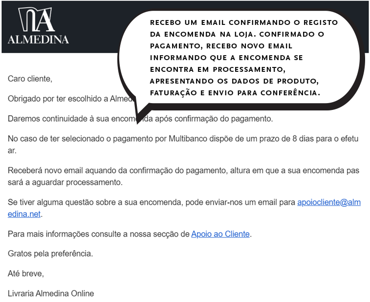 • Caso tal não seja possível, contacto o Serviço de Apoio ao Cliente (tel.: 239436166/email: apoiocliente@almedina.net) para efetuar a devolução;